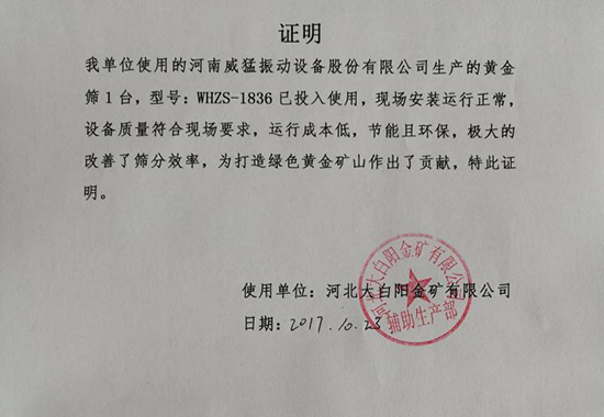 日前,威猛股份與河北大白陽金礦有限公司簽約,簽約設(shè)備黃金篩WHZS-1836 1臺投入使用,現(xiàn)場安裝運(yùn)行正常,極大改善了篩分效率。