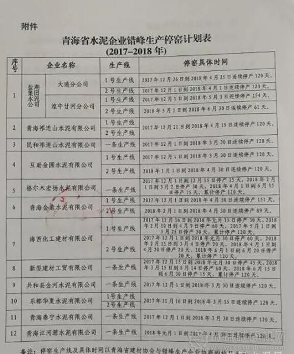 青海省水泥行業(yè)錯(cuò)峰生產(chǎn)停窯計(jì)劃表