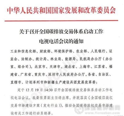 國家發(fā)改委近日發(fā)布《關(guān)于召開全國碳排放權(quán)交易體系啟動工作電視電話會議的通知》,定于12月19日14:30召開全國碳排放權(quán)交易體系啟動工作電視電話會議,國家發(fā)改委張勇副主任將出席,就落實全國碳排放權(quán)交易市場建設(shè)方案,推動全國碳排放權(quán)交易市場建設(shè)有關(guān)工作進行動員部署。