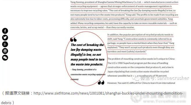 2017年11月,《澎湃新聞》英文版刊登了一篇題為“Shanghai Buckles Under Mounting Demolition Debris-Stricter waste dumping rules whip up clouds of dust in city suburb”(上海加強(qiáng)治理建筑垃圾非法傾倒)的文章,山美股份董事長楊安民先生就建筑垃圾處理等問題接受了《澎湃新聞》(英文版)記者采訪,并發(fā)表了相關(guān)觀點(diǎn):