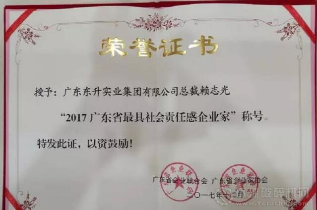 大會對十家“2017廣東省最具社會責(zé)任感企業(yè)”、十位“2017廣東省最具社會責(zé)任感企業(yè)家”進(jìn)行了表彰。廣東東升實(shí)業(yè)集團(tuán)有限公司榮獲“2017廣東省最具社會責(zé)任感企業(yè)”,集團(tuán)總裁賴志光“2017廣東省最具社會責(zé)任感企業(yè)家”。