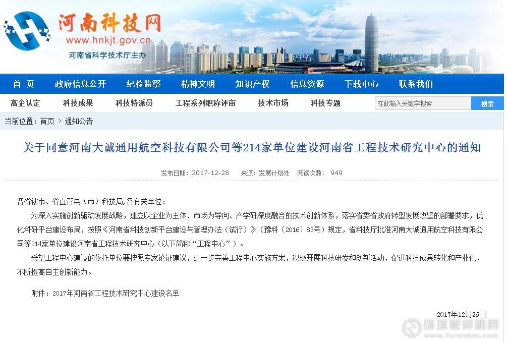 12月26日,河南省科學(xué)技術(shù)廳公布了2017年河南省工程技術(shù)研究中心建設(shè)名單,河南大誠(chéng)通用航空科技有限公司位列名單,成功獲批省級(jí)低品位黃金礦石選冶工程技術(shù)研究中心認(rèn)定。