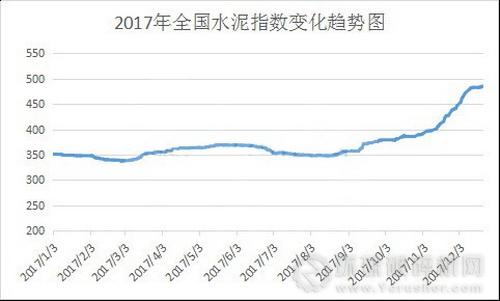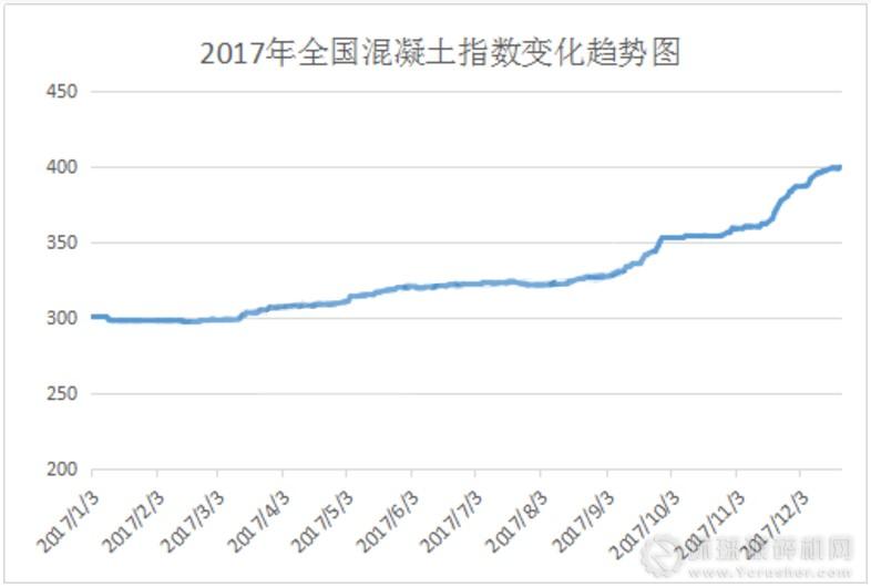 2017上半年全國混凝土市場行情緩慢上行,下半年行情突飛猛漲,尤其是9月、11月、12月份價(jià)格漲勢明顯。截止12月22日全國混凝土價(jià)格指數(shù)已達(dá)到400點(diǎn),較年初價(jià)格指數(shù)上漲100點(diǎn),再創(chuàng)歷史新高。
