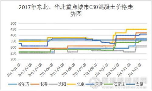 華北地區(qū)年初市場尚未恢復(fù),商混行情平穩(wěn),二季度市場需求大幅回升,水泥價(jià)格大幅拉漲,商混價(jià)格隨之上漲,其中北京、天津原材料供應(yīng)主要靠河北地區(qū)輸入,原材料價(jià)格上漲,加上運(yùn)輸成本較高,商混價(jià)格相對河北地區(qū)高出100元/方。三季度受高溫多雨天氣影響,華北地區(qū)商混行情持續(xù)回落,跌至年初水平,直至四季度環(huán)保整治影響,砂石、水泥價(jià)格一天一價(jià),混凝土成本大幅提升,加強(qiáng)四季度市場需求旺盛,商混供應(yīng)緊張,京津冀地區(qū)混凝土價(jià)格累計(jì)上漲80-100元/方。截止12月,華北區(qū)域北京地區(qū)混凝土價(jià)格最高,C30報(bào)價(jià)達(dá)到450元/方。