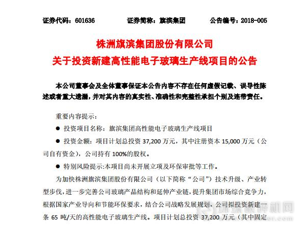 1月11日,旗濱集團(tuán)(601636.SH)發(fā)布公告表示,公司擬投資新建一條65噸/天的高性能電子玻璃生產(chǎn)線。項(xiàng)目名稱為“旗濱集團(tuán)高性能電子玻璃生產(chǎn)線項(xiàng)目”,計(jì)劃總投資37,200萬元(其中固定資產(chǎn)投資3.62億元),注冊(cè)資本15,000萬元(自有資金),公司有100%的股權(quán)。旗濱集團(tuán)將設(shè)立全資子公司進(jìn)行項(xiàng)目建設(shè)和運(yùn)營(yíng)管理,全資子公司暫定名為“株洲醴陵旗濱電子玻璃有限公司”(最終名稱以工商核準(zhǔn)登記名稱為準(zhǔn))。