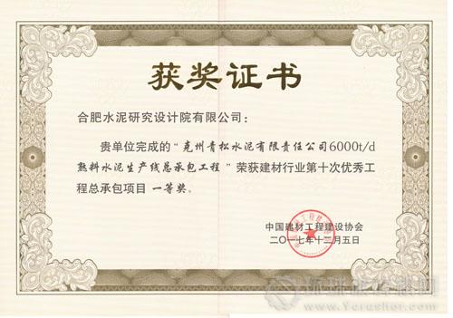 2、克州青松水泥有限責(zé)任公司6000t/d熟料水泥生產(chǎn)線總承包工程,獲優(yōu)秀工程總承包項目一等獎;