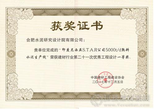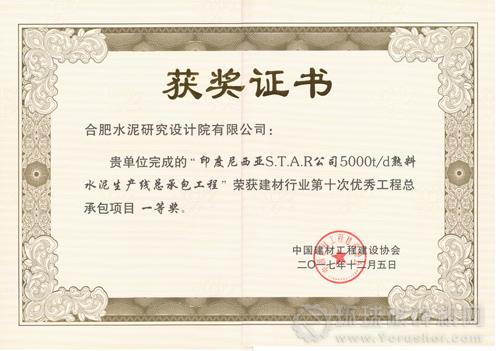 1、印度尼西亞S.T.A.R公司5000t/d熟料水泥生產(chǎn)線總承包工程,獲優(yōu)秀工程總承包項目一等獎;