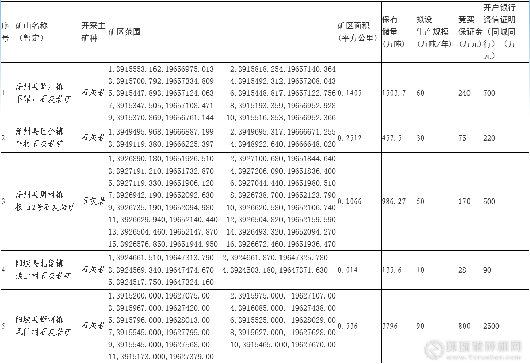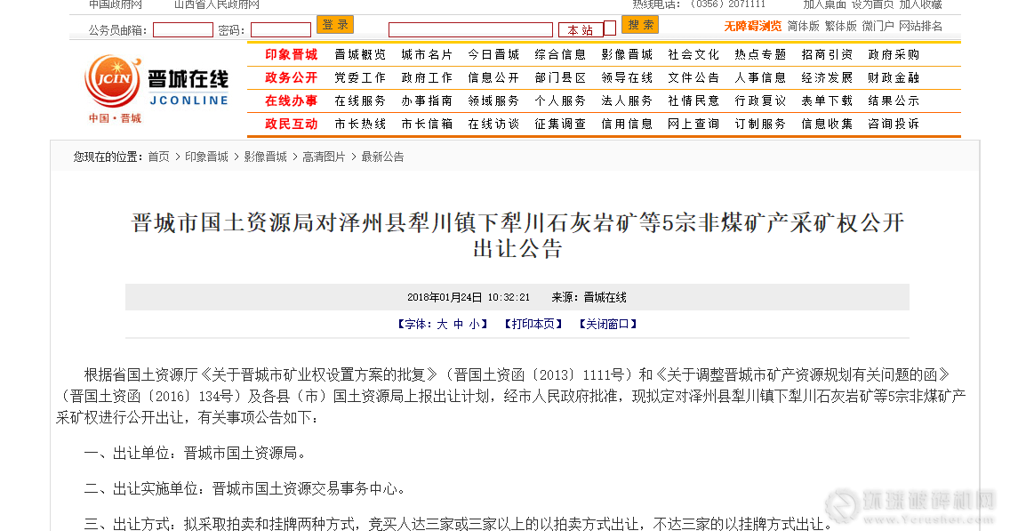 根據(jù)山西省國土資源廳《關(guān)于晉城市礦業(yè)權(quán)設(shè)置方案的批復(fù)》(晉國土資函〔2013〕1111號)和《關(guān)于調(diào)整晉城市礦產(chǎn)資源規(guī)劃有關(guān)問題的函》(晉國土資函〔2016〕134號)及各縣(市)國土資源局上報出讓計劃,經(jīng)市人民政府批準,現(xiàn)擬定對澤州縣犁川鎮(zhèn)下犁川石灰?guī)r礦等5宗非煤礦產(chǎn)采礦權(quán)進行公開出讓,有關(guān)事項公告如下: