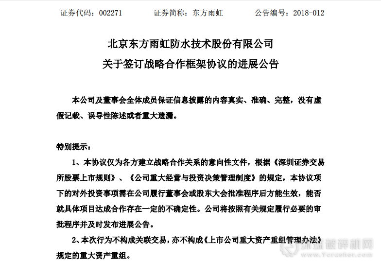 2017年11月26日,北京東方雨虹防水技術股份有限公司與來賓市人民政府簽訂了《戰(zhàn)略合作框架協(xié)議》,協(xié)議約定公司擬在來賓市投資建設特種砂漿、防水卷材、防水涂料、碳酸鈣礦、石英礦等項目。