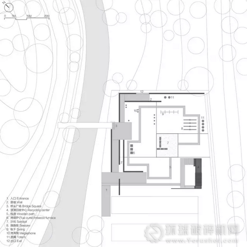 建筑分為內(nèi)外兩條流線,舊物投放池也向內(nèi)外兩側(cè)開口。內(nèi)側(cè)可供參觀和投放舊物的人群使用(紅色虛線)。外側(cè)則可以有車輛通過,運(yùn)走舊物以便集中處理。