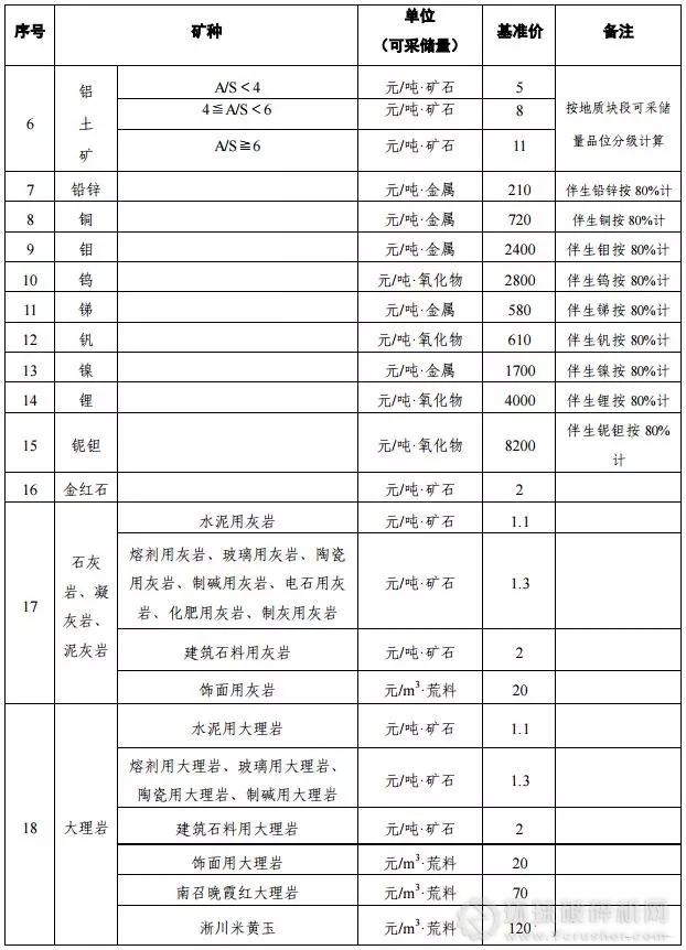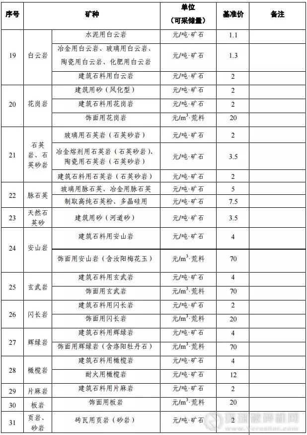 建筑石料用灰?guī)r2元/噸;建筑石料用白云巖2元/噸;天然石英砂:建筑用砂(河道砂)3.5元/噸;建筑石料用玄武巖4元/噸等。具體詳情見下面表格