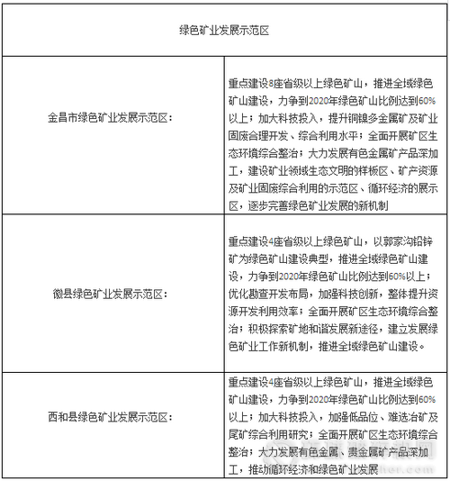 綠色礦山建設(shè)。大力推進(jìn)綠色礦山建設(shè)。按照政府引導(dǎo)、標(biāo)準(zhǔn)領(lǐng)跑、四級(jí)聯(lián)創(chuàng)、企業(yè)主建、第三方評(píng)估、社會(huì)監(jiān)督的原則,在用地、用礦、稅收等方面積極落實(shí)國(guó)家相關(guān)配套支持政策,努力促進(jìn)國(guó)家、省、市、縣級(jí)綠色礦山建設(shè),構(gòu)建綠色礦業(yè)發(fā)展長(zhǎng)效機(jī)制。省級(jí)綠色礦山創(chuàng)建標(biāo)準(zhǔn):守法合規(guī)、管理規(guī)范、安全生產(chǎn);重視綜合利用、注重科技創(chuàng)新、加強(qiáng)節(jié)能減排;礦山環(huán)境保護(hù)與治理恢復(fù)及時(shí)到位;較好地履行社會(huì)責(zé)任、礦地和諧,重視企業(yè)文化建設(shè)。各市州也要相應(yīng)明確市級(jí)綠色礦山建設(shè)標(biāo)準(zhǔn),積極推進(jìn)市級(jí)綠色礦山建設(shè),鼓勵(lì)引導(dǎo)其它礦山根據(jù)自身?xiàng)l件和能力,因地制宜逐步達(dá)到市級(jí)綠色礦山要求。