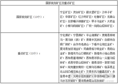 加強(qiáng)甘肅省13個(gè)國(guó)家規(guī)劃礦區(qū)、22個(gè)重點(diǎn)礦區(qū)的開(kāi)發(fā)保護(hù)和監(jiān)管。區(qū)內(nèi)其他礦種礦業(yè)權(quán)設(shè)置不得影響主要礦種的勘查開(kāi)采。按照規(guī)模開(kāi)發(fā)、集約利用、工藝先進(jìn)、綠色環(huán)保的原則,引導(dǎo)和支持各類(lèi)生產(chǎn)要素集聚,從資源配置、采礦用地、財(cái)稅政策等方面加大支持力度,促進(jìn)規(guī)模開(kāi)采和集約利用,推動(dòng)大中型現(xiàn)代化礦山基地建設(shè)。