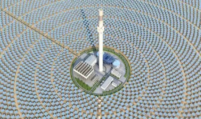 在沙漠中安裝上萬面定日鏡,環(huán)繞著260米的集熱裝置,隨著太陽的移位,保持最佳反射角度,聚光、吸熱、儲(chǔ)熱、換熱……聚集的陽光可以形成超過1000℃高溫,集熱器將熱量傳遞到塔下的熔鹽中,用水冷卻熔鹽的過程中產(chǎn)生大量蒸汽,推動(dòng)汽輪機(jī)產(chǎn)生電力。