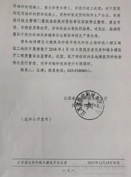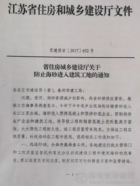 日前,江蘇省住房和城鄉(xiāng)建設(shè)廳印發(fā)了《關(guān)于防止海砂進(jìn)入建筑工地的通知》,通知主要要求如下: