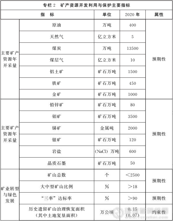 到2020年,非常規(guī)能源、戰(zhàn)略性新興產業(yè)礦產及傳統(tǒng)優(yōu)勢礦產實現(xiàn)找礦新突破,開發(fā)利用布局結構得到進一步優(yōu)化,節(jié)約集約和高效利用水平明顯提升,綠色礦山建設全面普及,礦山地質環(huán)境根本好轉,呈現(xiàn)礦產資源勘查開發(fā)與環(huán)境保護協(xié)調發(fā)展新局面。