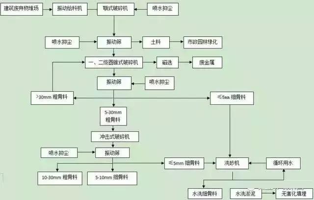 再生骨料的生產(chǎn)工藝流程見圖1。由圖1 可知,再生骨料的生產(chǎn)工藝非常簡(jiǎn)單,一般的建筑企業(yè)都能生產(chǎn)。若經(jīng)過相關(guān)職能部門的協(xié)調(diào)與扶持,完全有可能在一些大中城市或大型工地建立集中生產(chǎn)的再生骨料工廠。