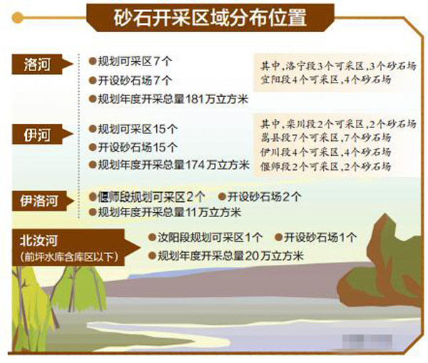 根據(jù)意見(jiàn)規(guī)劃的開(kāi)采區(qū)域,洛河、伊河、伊洛河、北汝河干流共設(shè)可采區(qū)25個(gè),開(kāi)設(shè)砂石場(chǎng)25個(gè),規(guī)劃年度開(kāi)采總量386萬(wàn)立方米。