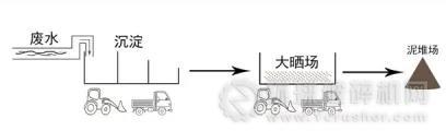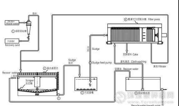 洗砂機(jī)→細(xì)砂回收機(jī)一臺(tái)(進(jìn)行0.075以上的顆粒回收)→廢水中轉(zhuǎn)水池(中轉(zhuǎn)以方便小部份細(xì)砂沉淀,可用可不用)→廢水處理系統(tǒng)(進(jìn)行變量加藥沉淀、清水回收、淤泥濃縮)→板框壓濾機(jī)(淤泥干化),如下圖所示: