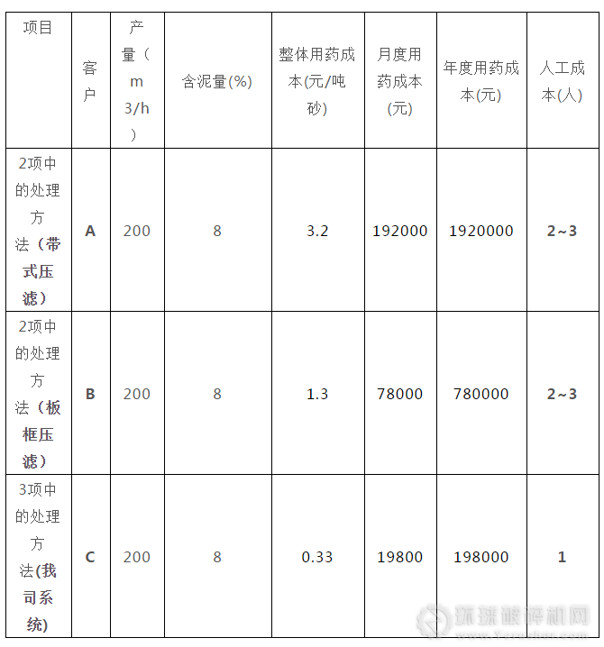洗砂用藥成本高(3-9元/噸)、需要多名技術(shù)人員、不能實(shí)時(shí)監(jiān)測調(diào)整藥量配比容易造成藥劑對砂體二次污染(帶式壓濾機(jī)重復(fù)用藥,成本加重,泥餅含水率高.板框壓濾機(jī)生產(chǎn)時(shí)間過長導(dǎo)致處理量降低)