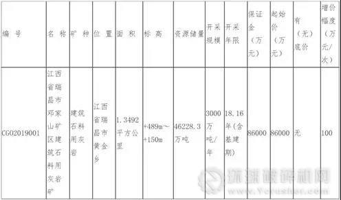日前,自然資源部網(wǎng)站轉(zhuǎn)發(fā)瑞昌市礦產(chǎn)資源儲備交易中心發(fā)布的《瑞昌市礦業(yè)權(quán)出讓網(wǎng)上掛牌公告》,顯示,江西省瑞昌市鄧家山礦區(qū)建筑石料用灰?guī)r礦業(yè)權(quán)正在掛牌出讓,開采規(guī)模3000萬噸每年,開采年限為18.16年(含基建期),起始價(jià)8.6億元。