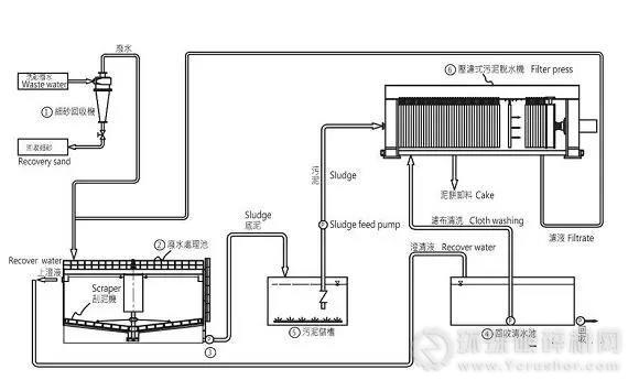 洗砂機→細砂回收機一臺(進行0.075以上的顆粒回收)→廢水中轉水池(中轉以方便小部份細砂沉淀,可選)→廢水處理系統(tǒng)(進行變量加藥沉淀、清水回收、淤泥濃縮)→板框壓濾機(淤泥干化),如下圖所示: