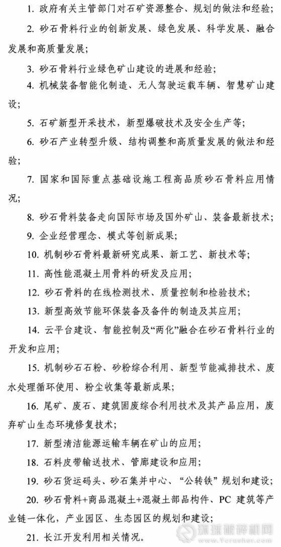 為了加快砂石骨料產(chǎn)業(yè)轉(zhuǎn)型升級(jí)、技術(shù)進(jìn)步和結(jié)構(gòu)調(diào)整的步伐,進(jìn)一步提升砂石骨料產(chǎn)品和裝備的制造水平,推動(dòng)行業(yè)向高質(zhì)量和綠色方向發(fā)展,交流行業(yè)最新成果和先進(jìn)實(shí)用技術(shù),促進(jìn)砂石骨料工業(yè)科技進(jìn)步。本次大會(huì)以“科技引領(lǐng) 融合發(fā)展”為主題,探討交流內(nèi)容如下: