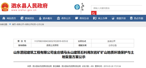 礦山地質(zhì)環(huán)境保護(hù)與土地復(fù)墾方案公示》文件中了解到,山東泗冠建筑工程有限公司金莊鎮(zhèn)馬頭礦區(qū)位于水縣城西南約12km,屬泗水縣金莊鎮(zhèn)管轄。總投資規(guī)模12582.8萬元。礦山剩余服務(wù)年限:截止2019年1月,剩余服務(wù)年限為 8.07年。礦業(yè)活動主要為建筑石料用石灰?guī)r露天開采。