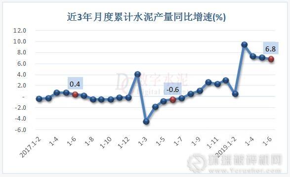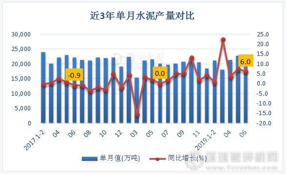 2019年上半年,全國累計(jì)水泥產(chǎn)量10.45億噸,同比增長6.8%,去年同期為下降0.6%。6月份,全國單月水泥產(chǎn)量2.1億噸,同比增長6%,增速高于去年同期6個(gè)百分點(diǎn),環(huán)比下降7.53%。