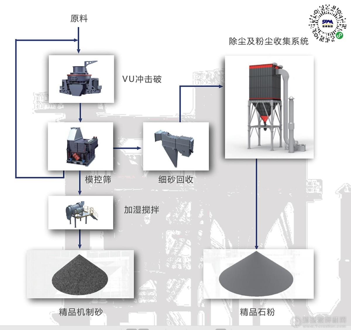 原料(可以是石屑、瓜米石等廉價易得的原料)經(jīng)過VU骨料優(yōu)化系統(tǒng)合理高效的處理后,產(chǎn)出級配合理、粒型圓潤、含粉量可控的成品砂,以及干燥潔凈、可進(jìn)行統(tǒng)一回收利用的高附加值石粉(根據(jù)原料決定可應(yīng)用范圍)。
