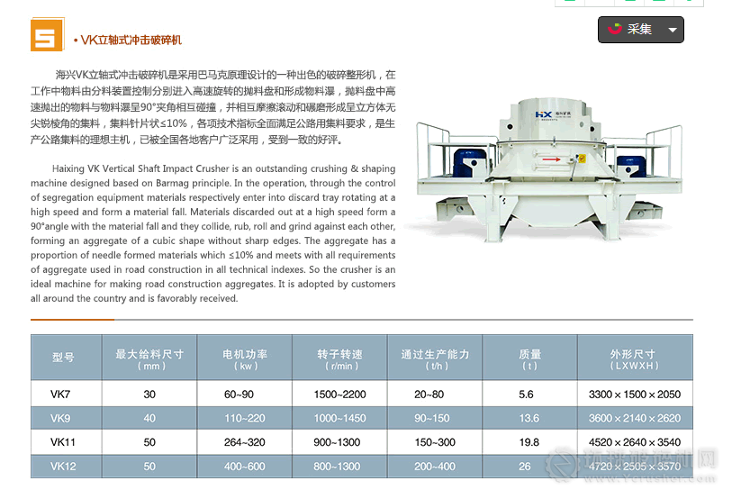二、杭州海興機械有限公司 VK立軸式?jīng)_擊破碎機