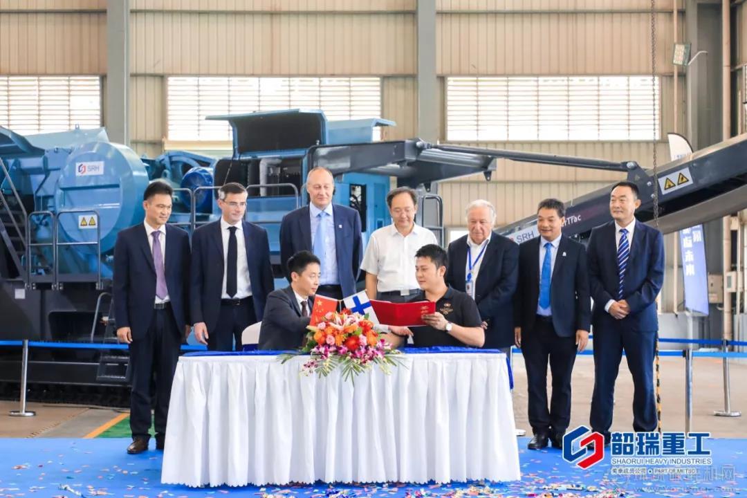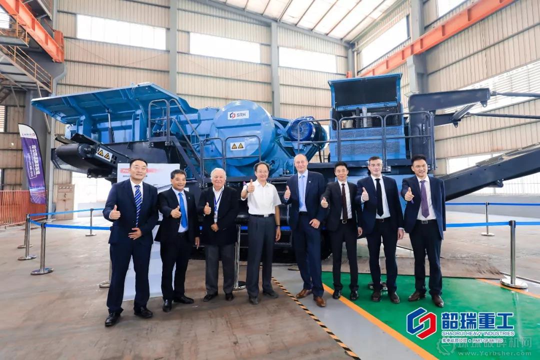 Mr.Markku Simula、Mr.Jack Marmet、梁曉峰先生、Mr. Federico Maurilli、殷煥明市長、伊凱先生、劉興先生、劉東先生共同為韶瑞重工首臺移動破碎篩分設備揭幕。