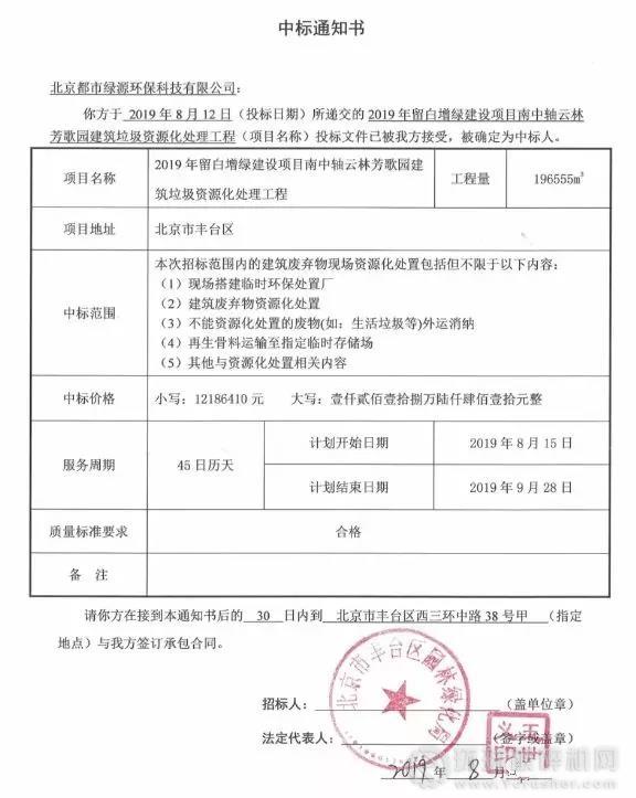 據(jù)了解,日前,北京都市綠源環(huán)保科技有限公司成功中標(biāo)2019年留白增綠建設(shè)項(xiàng)目南中軸云林芳歌建筑垃圾資源化處理項(xiàng)目,該項(xiàng)目總工程量約20萬(wàn)方!