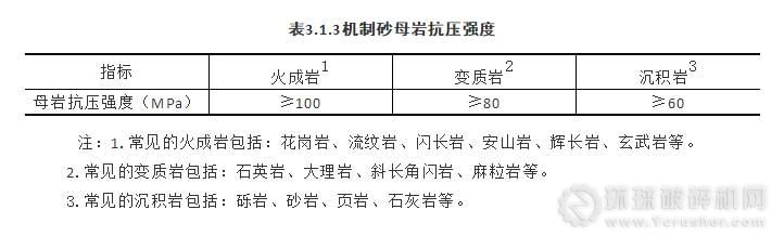 3.1.3用于生產(chǎn)機(jī)制砂的母巖抗壓強(qiáng)度應(yīng)符合表3.1.3的規(guī)定;以卵石、碎石以及尾礦作為料源,則其破碎后的砂粒壓碎值必須滿足本指引表4.2.6的要求。