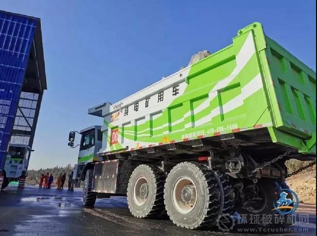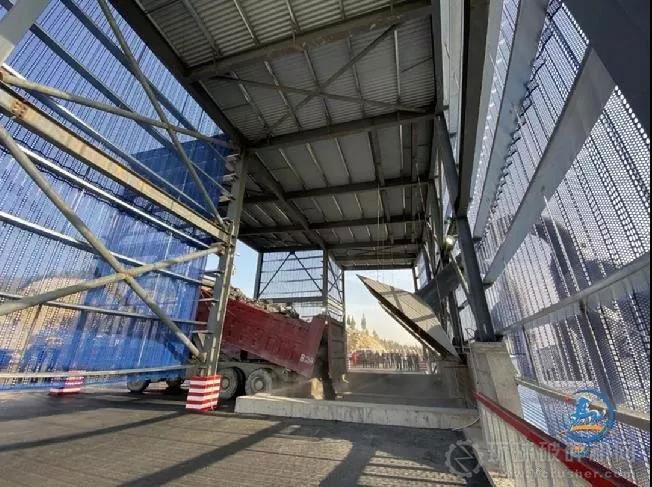 11月15日,并排著的兩輛卡車將碎石傾倒至下料口,經(jīng)破碎后進(jìn)入緩沖料棚,除塵系統(tǒng)和噴淋系統(tǒng)同步啟用,標(biāo)志著千業(yè)新材料破碎系統(tǒng)帶負(fù)荷一次試車成功。