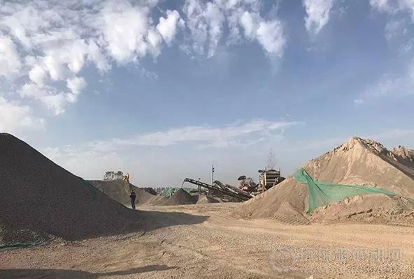 建筑垃圾分解成小塊,另一臺機(jī)器不停轟鳴,將石塊碎成碎石子或是砂石。空地上是一層塵土,堆放著幾堆已經(jīng)碎好的砂石,上面蓋著的綠色編織網(wǎng)早已