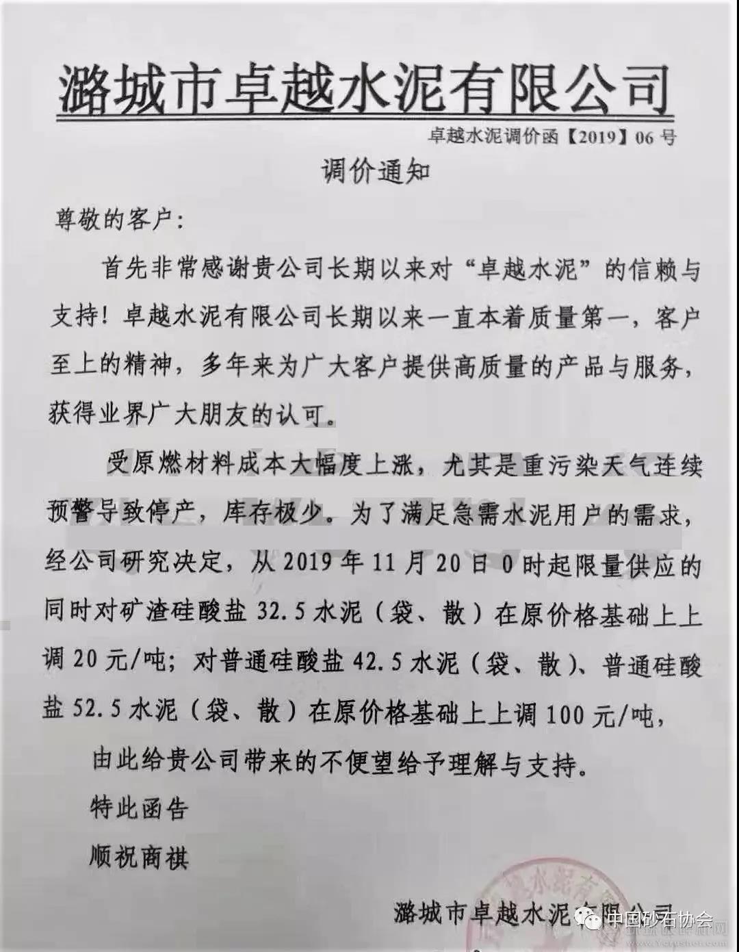 據(jù)悉,受原燃材料成本大幅度上漲,尤其是重污染天氣連續(xù)預(yù)警導(dǎo)致停產(chǎn),庫存極少。山西某水泥有限公司發(fā)布調(diào)價通知稱,為了滿足急需水泥用戶的需求,經(jīng)公司研究決定:從11月20日0時起限量供應(yīng)的同時對