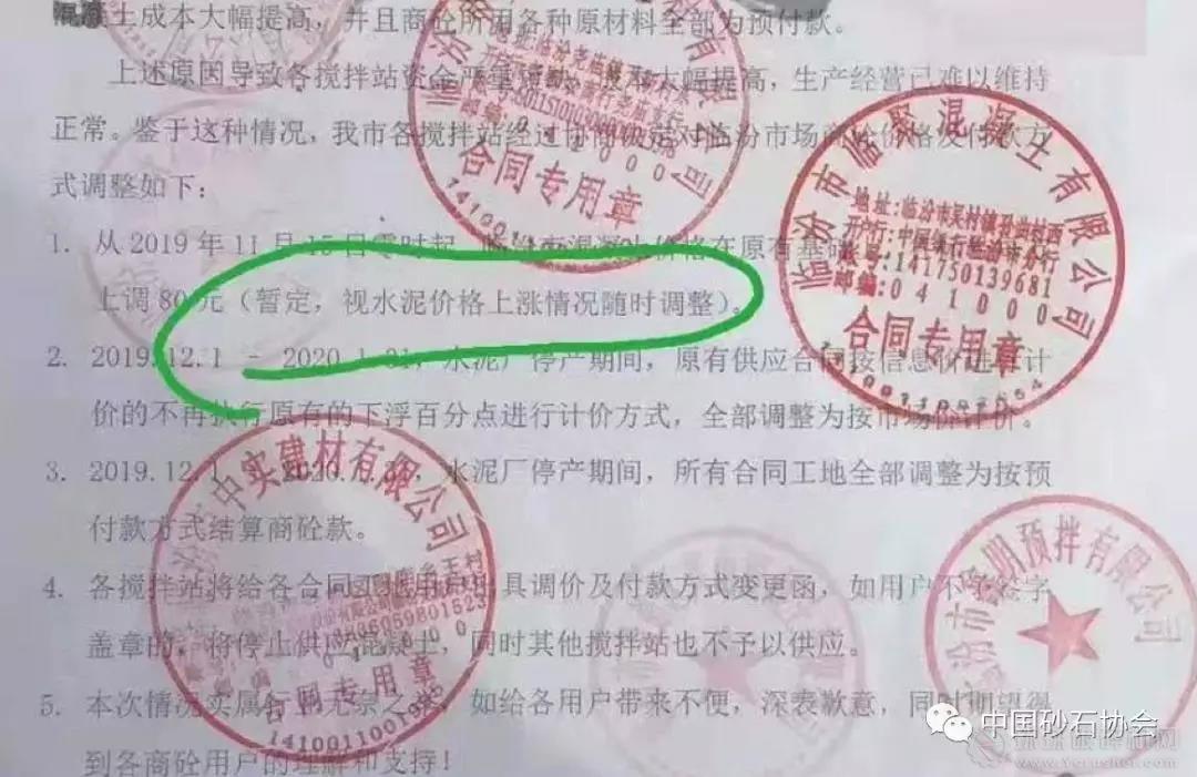 日前,山西臨汾市商砼協(xié)會發(fā)函稱,近一時期水泥廠已經(jīng)開始錯峰生產(chǎn),并且根據(jù)環(huán)保需求從12月1日至2020年1月有31日臨汾市水泥廠全部停產(chǎn),這種情況將會造成臨汾市場水泥嚴(yán)重短缺并且價格大幅上漲,連續(xù)幾次累計漲價近100元/噸。協(xié)會宣布,2019年11月15日零時起,混凝土價格在原基礎(chǔ)上上調(diào)80元/噸。