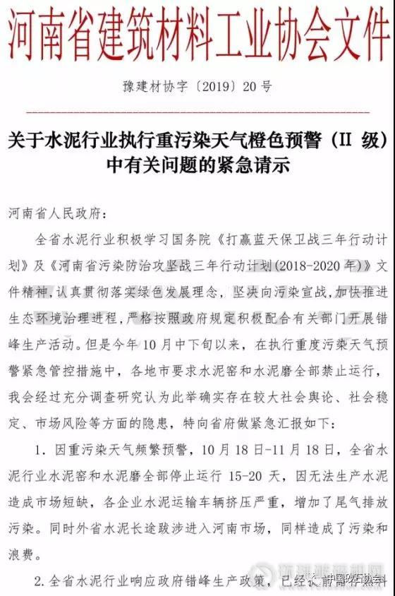 全省水泥行業(yè)積極學(xué)習(xí)國務(wù)院《打贏藍(lán)天保衛(wèi)戰(zhàn)三年行動計劃》及《河南省污染防治攻堅戰(zhàn)三年行動計劃(2018-2020年)》文件精神,認(rèn)真貫徹落實綠色發(fā)展理念, 堅決向污染宣戰(zhàn),加快推進生態(tài)環(huán)境治理進程,嚴(yán)格按照政府規(guī)定積極配合有關(guān)部門開展錯峰生產(chǎn)活動。但是今年10月中下旬以來,在執(zhí)行重度污染天氣預(yù)警緊急管控措施中,各地市要求水泥窯和水泥磨全部禁止運行,我會經(jīng)過充分調(diào)查研究認(rèn)為此舉確實存在較大社會輿論、社會穩(wěn)定、市場風(fēng)險等方面的隱患,特向省府做緊急匯報如下: