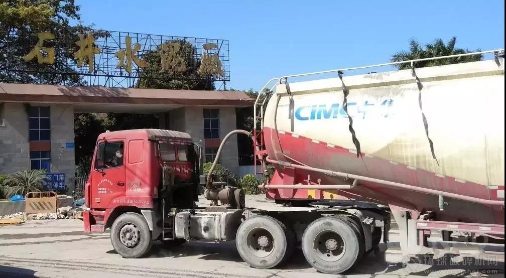 石井水泥廠門(mén)口,一輛水泥罐車(chē)駛過(guò)