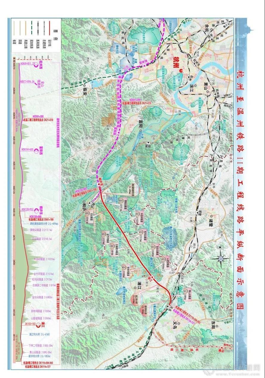 線路自湖州至杭州西至杭黃鐵路連接線工程桐廬東站(僅含站房)至滬昆客專義烏站(不含),線路全長58.397公里。鐵路等級高速鐵路、雙線、設(shè)計行車速度350公里/小時。全線新建橋梁21座全長16.662公里,隧道22座全長 39.196公里。新建浦江站和桐廬東站(僅含站房)。工程建設(shè)工期3.5年,工程總投資91.93億元。