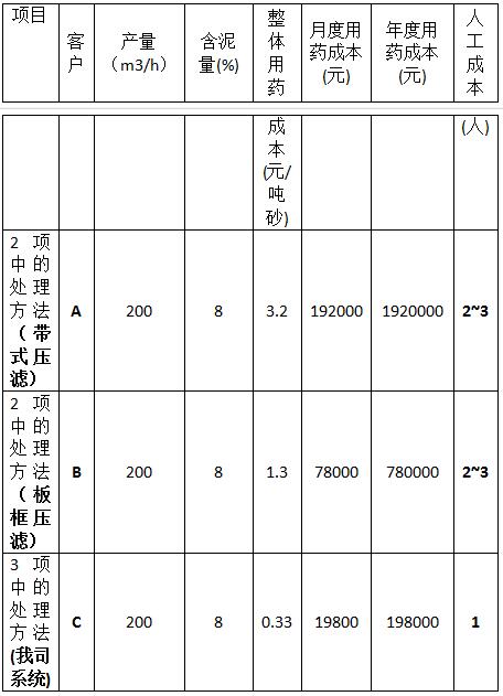 項目客戶產(chǎn)量(m3/h)含泥量(%)整體用藥成本(元/噸砂)月度用藥成本 (元)年度用藥成本(元)人工成本(人)