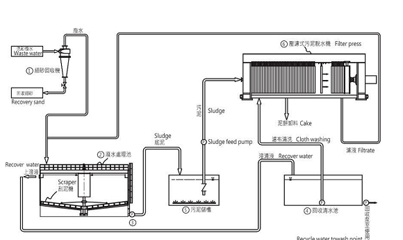 流程如下:洗砂機→細砂回收機一臺(進行0.075以上的顆粒回收)→廢水中轉(zhuǎn)水池(中轉(zhuǎn)以方便小部份細砂沉淀,可用可不用)→廢水處理系統(tǒng)(進行變量加藥沉淀、清水回收、淤泥濃縮)→板框壓濾機(淤泥干化),如下圖所示: