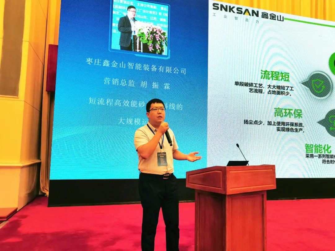 在大會主題報告上,棗莊鑫金山營銷總監(jiān)胡振霖作了題為《短流程高效能砂石骨料線的大規(guī)模應(yīng)用》的精彩報告演講。報告中,系統(tǒng)介紹了鑫金山獨特的短流程高效能砂石骨料生產(chǎn)線在行業(yè)中的大規(guī)模應(yīng)用。并以綠色礦山中綠色骨料線的“節(jié)能、環(huán)保、智能、集約”四大方面為核心,根據(jù)鑫金山時產(chǎn)600t—3000t的骨料線具體案例,詳細展示如何用EPC的方式建設(shè)一條符合綠色礦山要求的短流程高效能砂石骨料生產(chǎn)線。吸引了眾多與會嘉賓的高度關(guān)注。