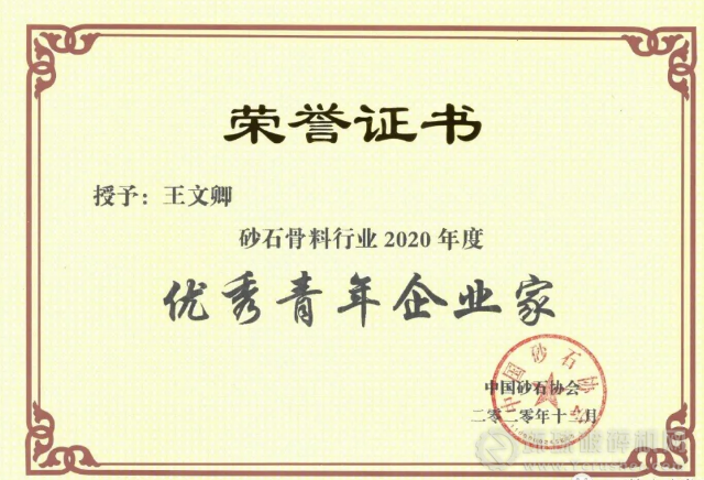 副總經(jīng)理王文卿被評為全國砂石骨料行業(yè)“優(yōu)秀青年企業(yè)家”