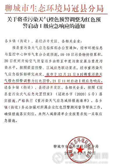 濟寧市重污染天氣應(yīng)急工作領(lǐng)導(dǎo)小組辦公室發(fā)布《關(guān)于將環(huán)境空氣污染預(yù)警等級調(diào)整為紅色的緊急通知》稱,自2020年12月21日1時將重污染天氣橙色預(yù)警調(diào)整為紅色預(yù)警,21日7時啟動I級應(yīng)急響應(yīng)。