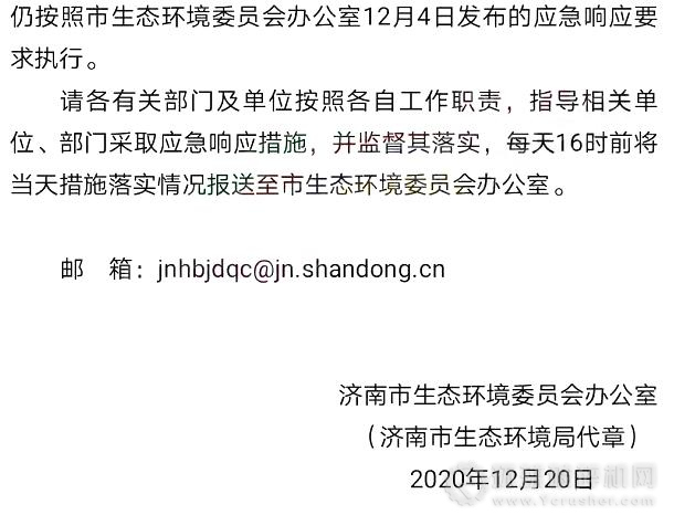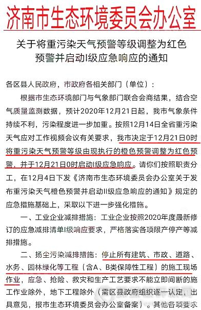 濟南市生態(tài)環(huán)境委員會辦公室通知自12月21日0時將重污染天氣預(yù)警等級由現(xiàn)執(zhí)行的橙色預(yù)警調(diào)整為紅色預(yù)警,并于12月21日0時啟動I級應(yīng)急響應(yīng)。工業(yè)企業(yè)按照2020年度最新修訂的應(yīng)急減排清單I級響應(yīng)要求,嚴(yán)格落實各項限產(chǎn)停產(chǎn)等減排措施。