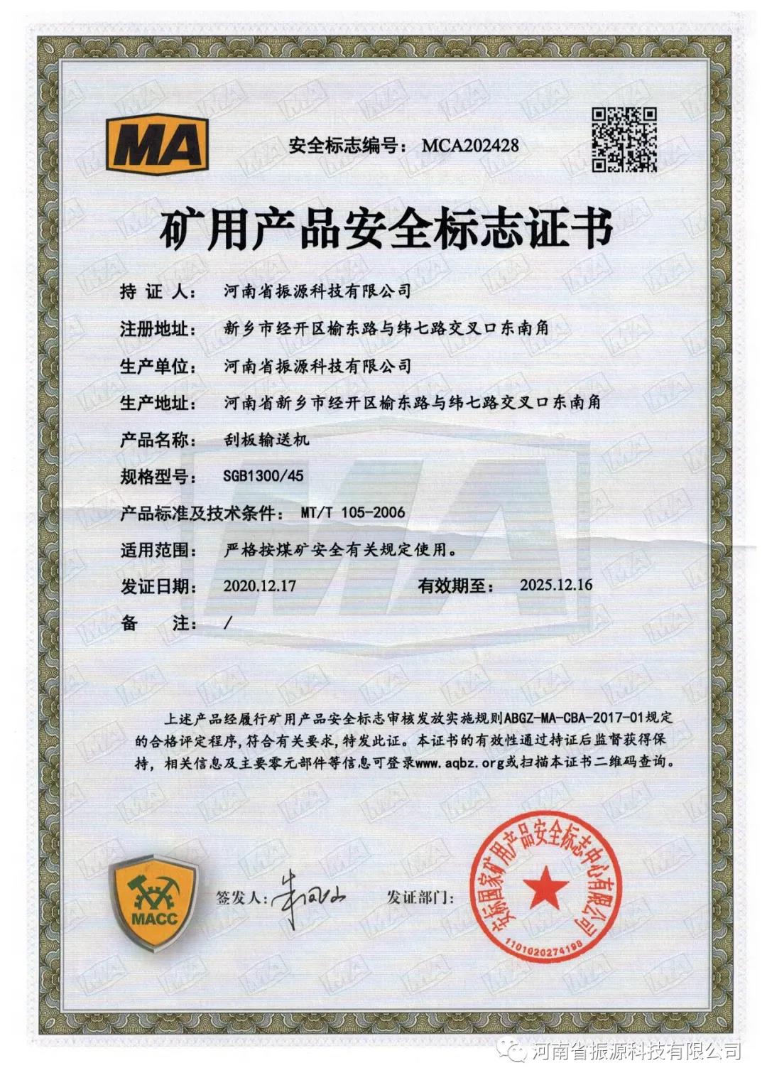 輸送機(jī)順利通過“安標(biāo)國家礦用產(chǎn)品安全標(biāo)志中心”驗收,取得煤安證書!