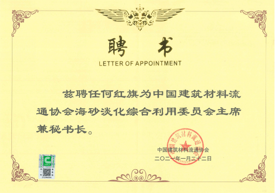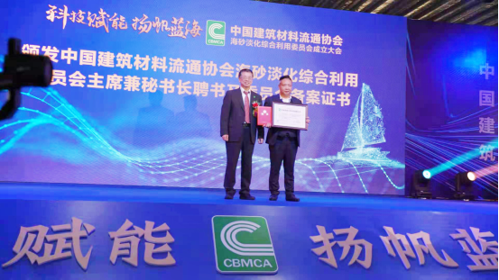 在本次成立大會上,中材建筑科技集團董事長何紅旗獲聘為海砂淡化綜合利用委員會主席兼秘書長。中國建筑材料流通協(xié)會會長秦占學為其頒發(fā)聘書以及社會團體分支機構(gòu)備案證書。而后,何紅旗主席兼秘書長分別為海砂淡化綜合利用委員會常務(wù)副主席林國忠、副主席劉政生、執(zhí)行秘書長黃冠日、常務(wù)副秘書長嚴望平、副秘書長劉超、副秘書長鄧盛國頒發(fā)聘書。
