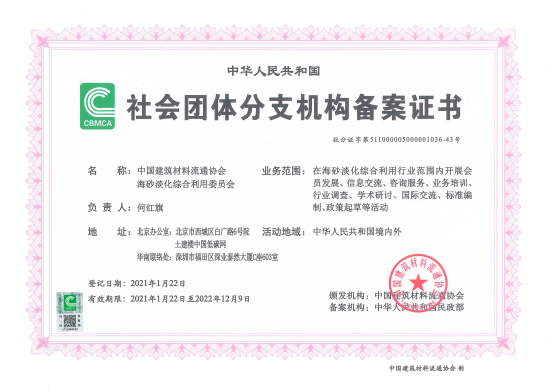 在此背景下,中國建筑材料流通協(xié)會海砂淡化綜合利用委員會應運而生。中國建筑材料流通協(xié)會是經(jīng)國家民政部批準成立的全國建筑材料流通業(yè)的行業(yè)性組織,由建材流通企業(yè)、建材生產(chǎn)企業(yè)、建材與家居商品市場、建材與家居經(jīng)銷商、建材物流與信息化服務(wù)企業(yè)以及科研和教育部門、相關(guān)社會團體、相關(guān)專家學者等自愿結(jié)成的全國性、行業(yè)性社會團體。中國建筑材料流通協(xié)會希望通過成立海砂淡化綜合利用委員會,進一步匯聚行業(yè)各方機構(gòu),連通產(chǎn)業(yè)鏈上下游,促進和規(guī)范我國海砂淡化產(chǎn)業(yè)的發(fā)展,提高行業(yè)管理水平和服務(wù)水準,為國家相關(guān)政府部門建言獻策,為商協(xié)會、科研機構(gòu)和企業(yè)建立溝通渠道、加強交流與合作。
